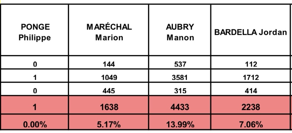 Enfin, malgré les gesticulations et provocations de la France Insoumise, Manon Aubry ne dépasse pas les 10% (9,87%) mais enregistre tout de même une petite progression.