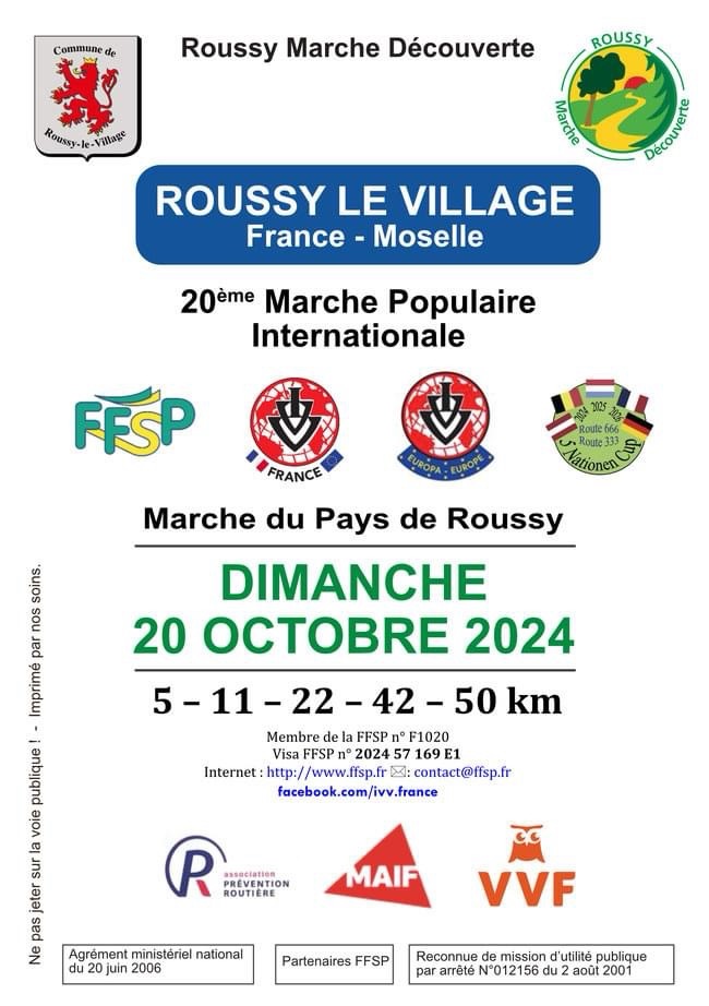 Dimanche 20 octobre 2024, grande marche IVV à Roussy le village avec participation au challenge longues distances « La Coupe des 5 Nations » (Allemagne, Autriche, Belgique, France, Luxembourg).