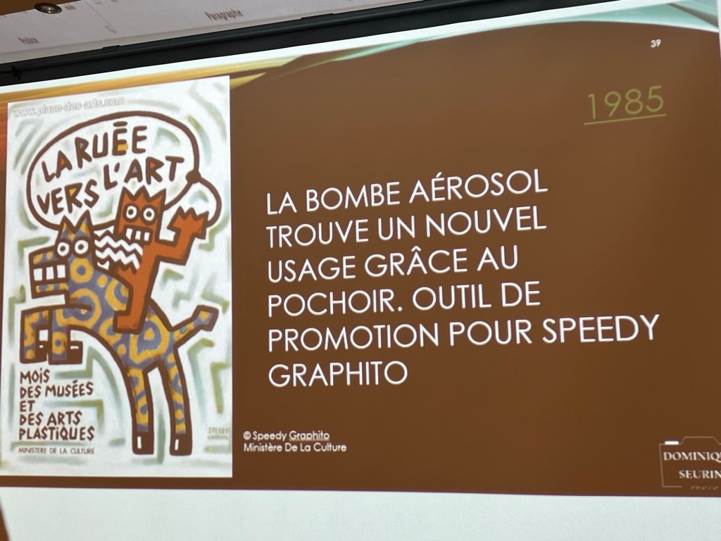 Dominique Seurin, spécialiste de cet art, retrace lors de sa conférence l’évolution du Street Art, de ses origines jusqu’à son explosion mondiale au XXIe siècle. Les festivaliers de cet art alternatif ainsi que les figures emblématiques du milieu seront mis à l’honneur, tout en abordant les questions sociétales qu’il soulève, comme la légalité et la place de l’art dans l’espace public.