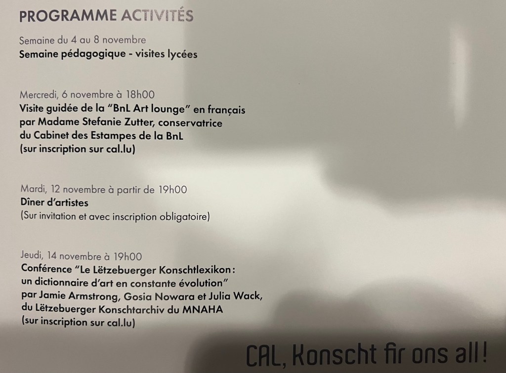 Le Cercle Artistique de Luxembourg (CAL) est une association luxembourgeoise fondée en 1893 qui soutient et promeut les artistes visuels du Luxembourg. Son objectif principal est de favoriser le développement de l’art au Luxembourg et de créer des opportunités pour les artistes d’exposer et de partager leur travail avec le public. Chaque année, le CAL organise une exposition appelée “Salon du CAL,” qui est l’un des événements artistiques les plus prestigieux du pays.