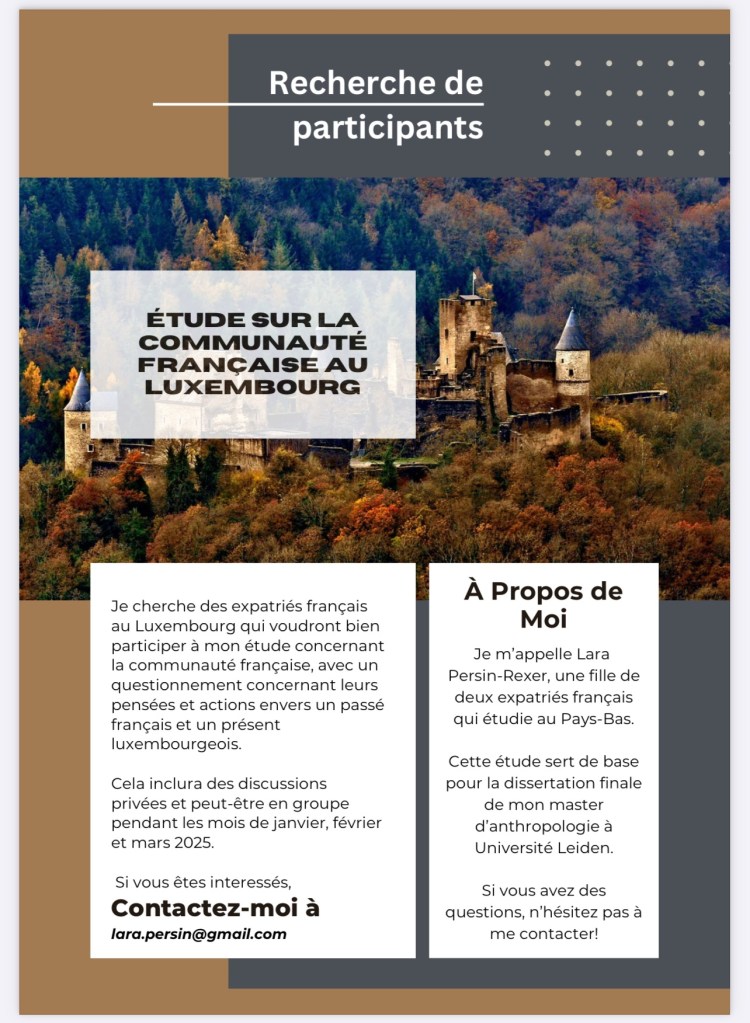 Recherche de participants à une étude sur la Communauté Française au Luxembourg – message de Lara Persin Rexer