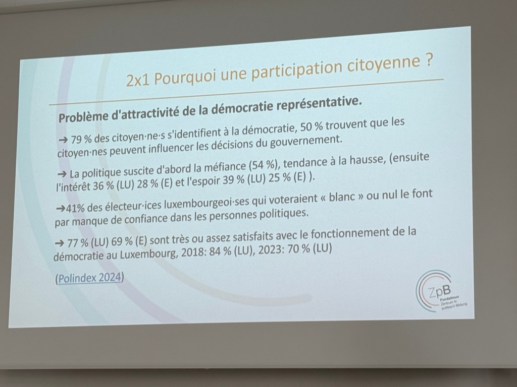 Cette formation continue, organisée en collaboration avec le Zentrum fir politesch Bildung (ZpB) et le SYVICOL, était donnée entièrement en français. Elle visait à sensibiliser les participant·e·s aux enjeux de la participation citoyenne à l’échelle communale et à encourager une meilleure implication des citoyen·ne·s dans les processus décisionnels locaux.