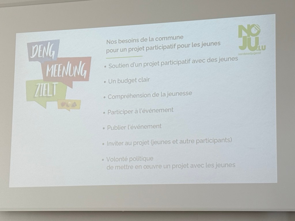 Une attention particulière était accordée à la participation des jeunes dans la commune, grâce à des initiatives comme “DENG MEENUNG ZIELT” (Nordstadjugend). Cette initiative vise à :