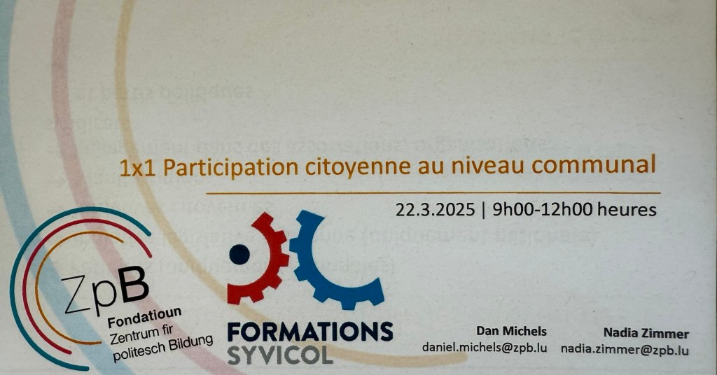 Un membre de la Communauté des Français du Luxembourg et (peut-être) une future membre ont participé à « L’ABC de la participation citoyenne dans la commune » (1×1 Biergerbedeelegung an der Gemeng) le samedi 22 mars 2025, de 9h00 à 12h00 au CENTRE CULTUREL “AL SCHOUL” à Schieren.