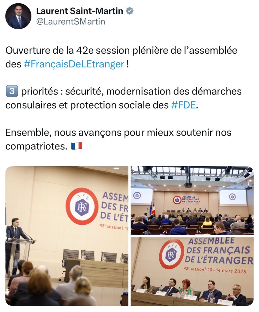 Lors de la 42e session de l’Assemblée des Français de l’étranger (AFE), Laurent Saint- Martin a exposé une feuille de route articulée autour de trois priorités : la sécurité, la modernisation des services consulaires et la protection sociale.