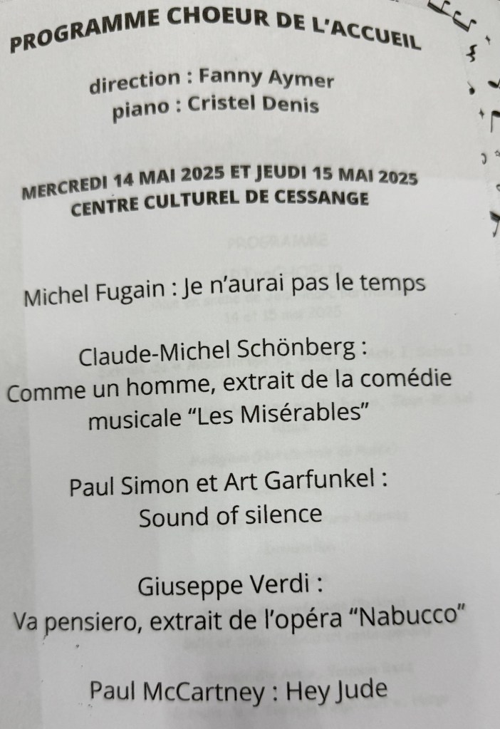 Le programme, éclectique, a voyagé du répertoire français (Michel Fugain) à l’opéra italien (Va pensiero de Verdi), en passant par la comédie musicale (Les Misérables), Simon & Garfunkel (Sound of Silence) et Paul McCartney (Hey Jude).