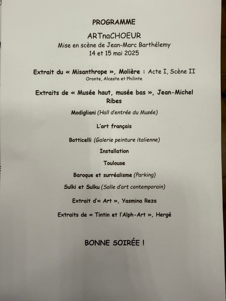 ARTnaCHOEUR, sous la direction de Jean-Marc Barthélemy, a proposé un programme théâtral riche mêlant classiques et contemporains :
