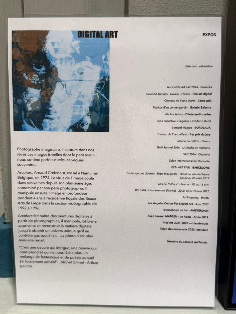 Le parcours se poursuit avec Arcofarc, et avec d’autres artistes, d’expériences digitales en performance, en passant par les toiles chaleureuses de ChrisDams, d’Alain Claude ou les photos magique de Xoufo.