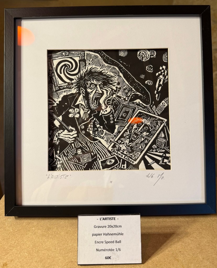 Pour finir, nous n’oublierons pas les pas de danse de Nancy Wattié (Narty). Enfin, Mo lui-même, qui boucle la boucle avec une gravure troublante : Deux mots. Une mise en abyme de l’artiste face à l’œuvre, et de l’œuvre face à l’artiste.