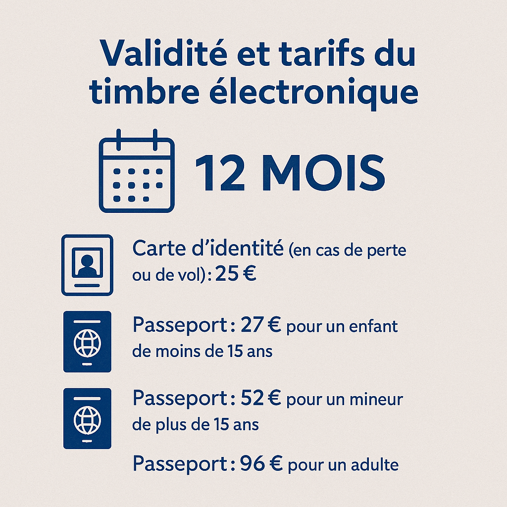 Le timbre électronique reste valable 12 mois à compter de la date d’achat, même en cas d’évolution des tarifs.
