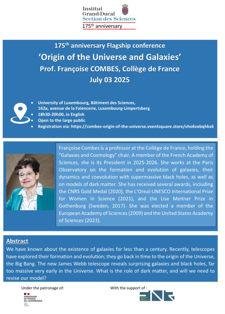 À l’occasion du 175e anniversaire de la Section des Sciences de l’Institut Grand-Ducal, une conférence scientifique de prestige sera donnée par la professeure Françoise Combes, astrophysicienne renommée du Collège de France. Intitulée « L’origine de l’Univers et des galaxies », cette conférence se tiendra le jeudi 3 juillet 2025, à l’Université du Luxembourg (Bâtiment des Sciences, Limpertsberg), de 18h30 à 20h00. La conférence sera en anglais et ouverte à tous sur inscription préalable.