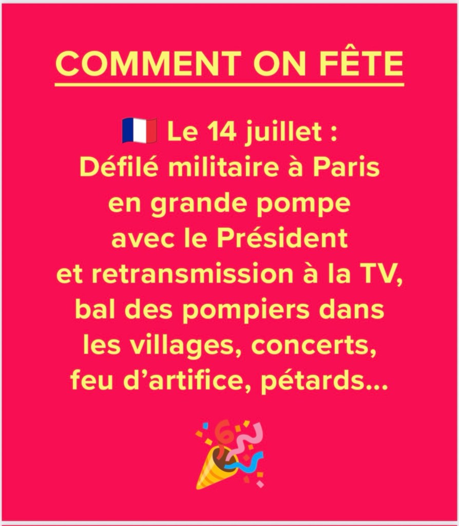 Entre le traditionnel dĂ©filĂ© militaire retransmis en direct Ă la TV,, les discours empreints de solennitĂ© â notamment celui attendu de Madame lâAmbassadrice de France â et les Ă©changes chaleureux autour de petits fours cette journĂ©e est Ă la fois un moment de fiertĂ©, de mĂ©moire et de partage.