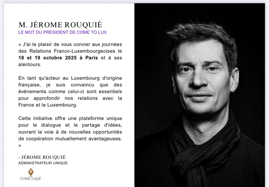 Mr Jerome Rouquié a le plaisir de vous convier en avant-première à la prochaine édition de Paris-Lux, le voyage sensoriel d’exception qui se tiendra les samedi 18 et dimanche 19 octobre, au profit de la Fondation Sarah Grond, entre prestige, culture, diplomatie, art de vivre et découverte.