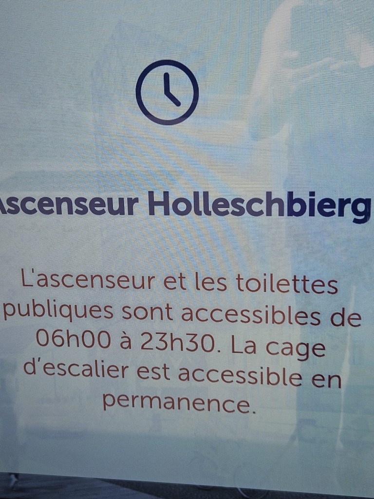 L’ascenseur et les toilettes publiques sont accessibles de 6:00 à 23:30. La cage d’escalier est accessible en permanence.