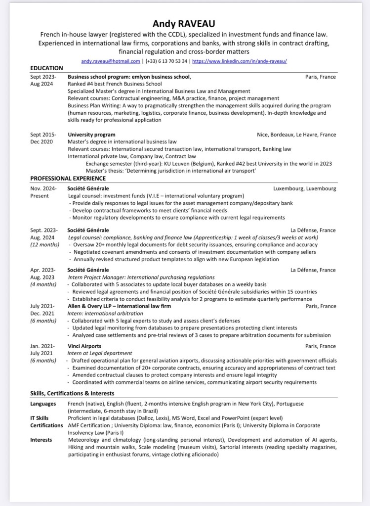 CV Andy RAVEAU / Juriste junior en droit fonds d’investissement et droit financier / Communauté Française en recherche d’opportunités au Luxembourg