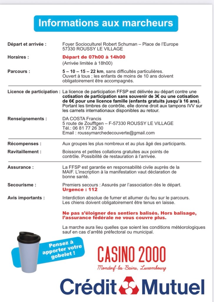 Les départs auront lieu de 7h00 à 14h00 depuis le foyer socioculturel Robert Schuman – Place de l’Europe à Roussy-le-Village, avec une arrivée prévue au plus tard à 18h00.