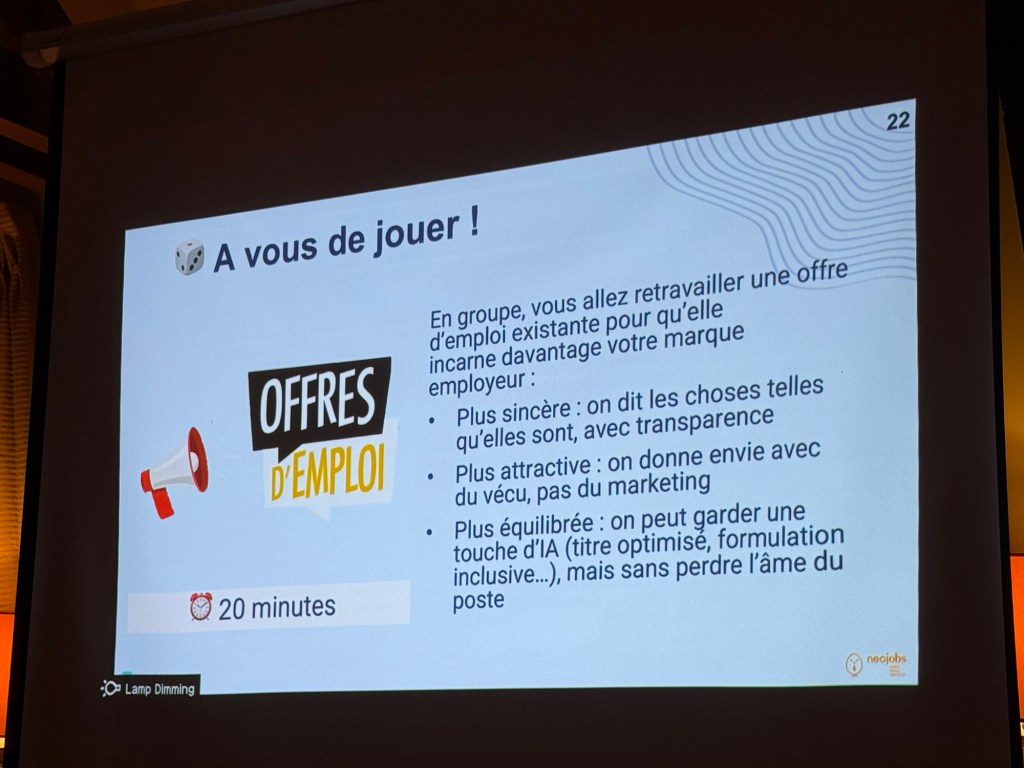 Dans le cadre dâun workshop, nous avions pour mission â en seulement 20 minutes â de retravailler une annonce de recrutement existante avec lâIntelligence Artificielle afin de la rendre plus authentique, plus attractive et mieux alignĂ©e avec la marque employeur.