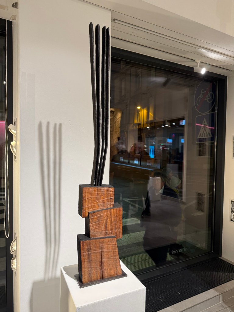 Les visiteurs du vernissage ont pu déambuler parmi une série de pièces inédites, parfaitement mises en valeur dans l’espace lumineux de la Galerie Simoncini. Les sculptures, installées sur des socles épurés, invitent à une contemplation silencieuse. Elles captent l’œil par leur verticalité, mais aussi par la richesse des détails – stries, charbons, entailles, angles – qui révèlent un travail artisanal d’une grande finesse.