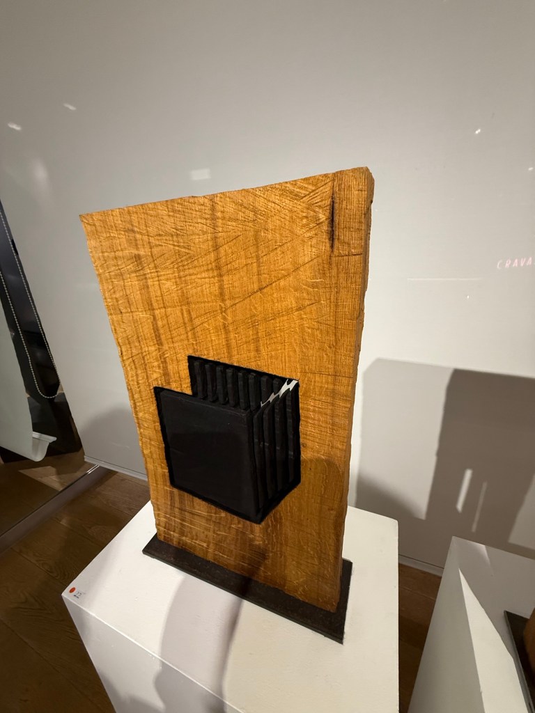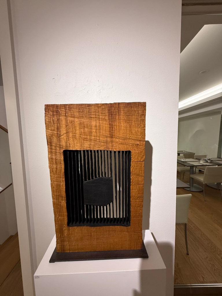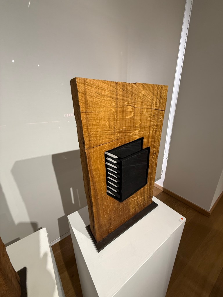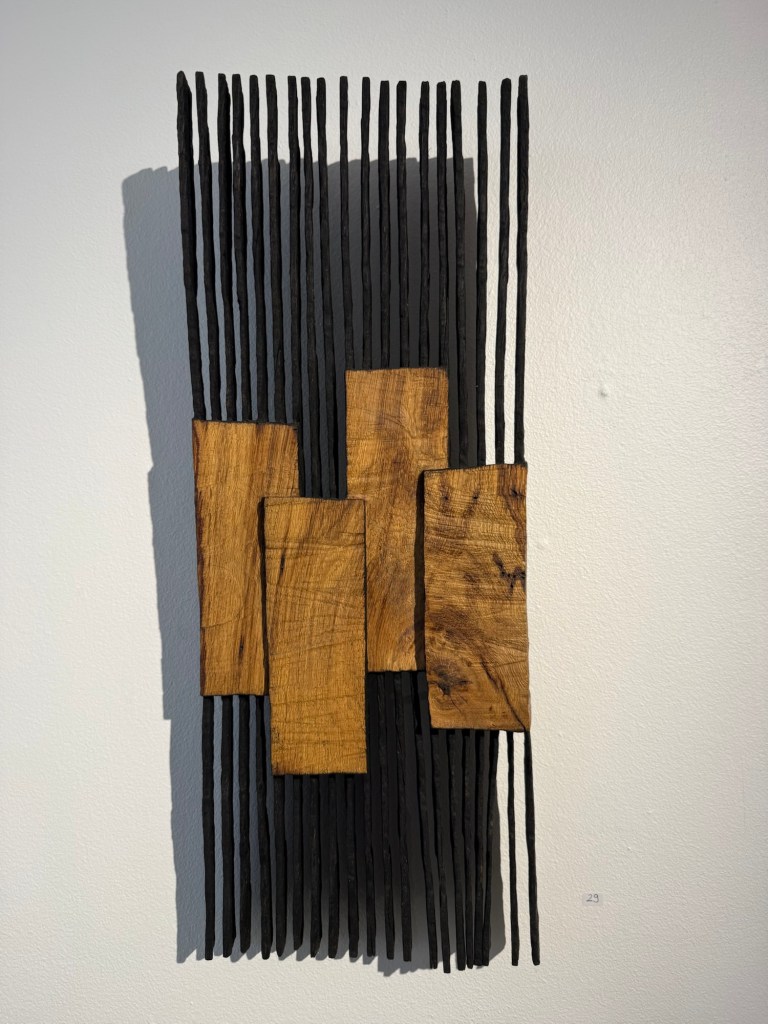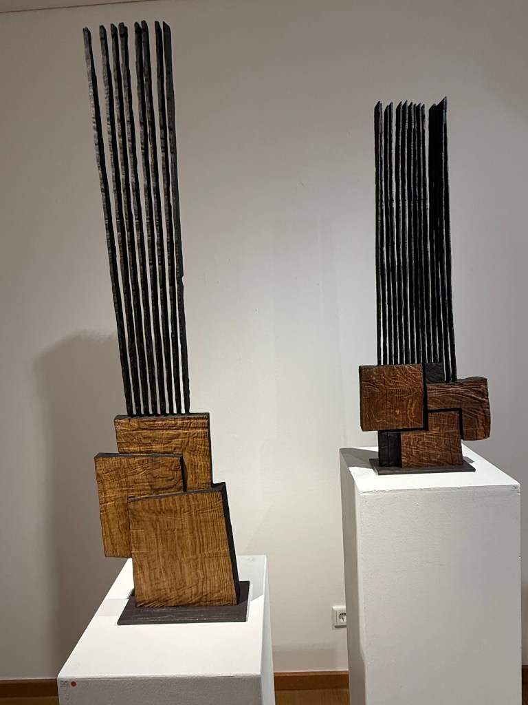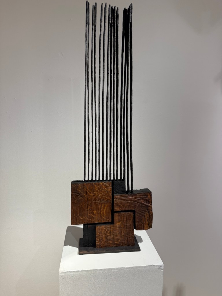 Chaque sculpture offre un dialogue entre stabilité et tension, entre force et fragilité, entre la chaleur du bois et l’austérité du noir brûlé ou oxydé.