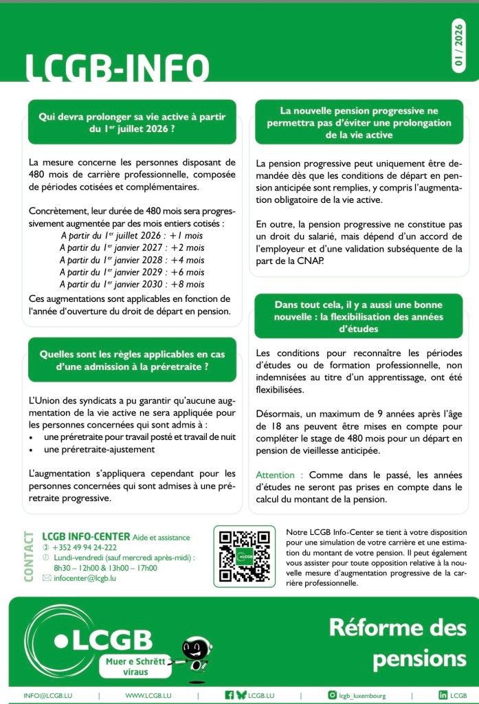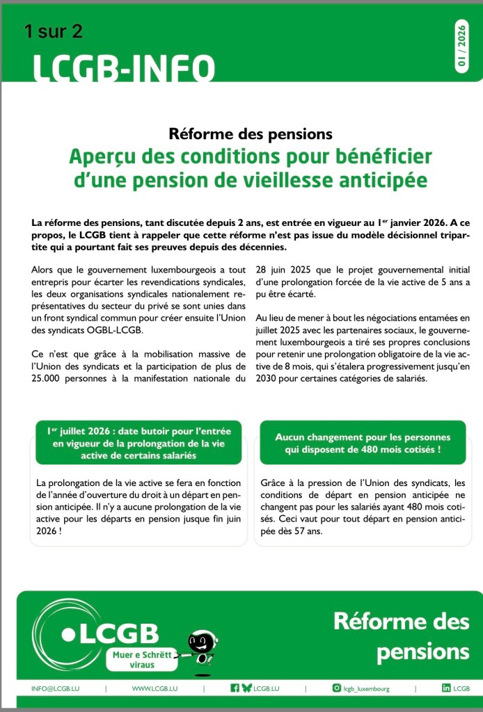 Entrée en vigueur au 1er janvier 2026, la réforme des retraites au Luxembourg modifie les conditions d’accès à la pension de vieillesse anticipée. Publié par le LCGB, ce document officiel autorise et encourage explicitement la diffusion de l’information afin d’aider les salariés à mieux comprendre leurs droits.