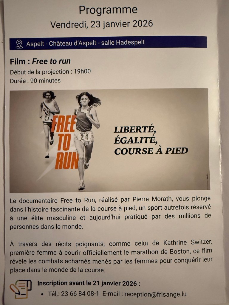 La manifestation débute à Aspelt (Château d’Aspelt – salle Hadespelt) avec la projection du documentaire Free to Run à 19h.