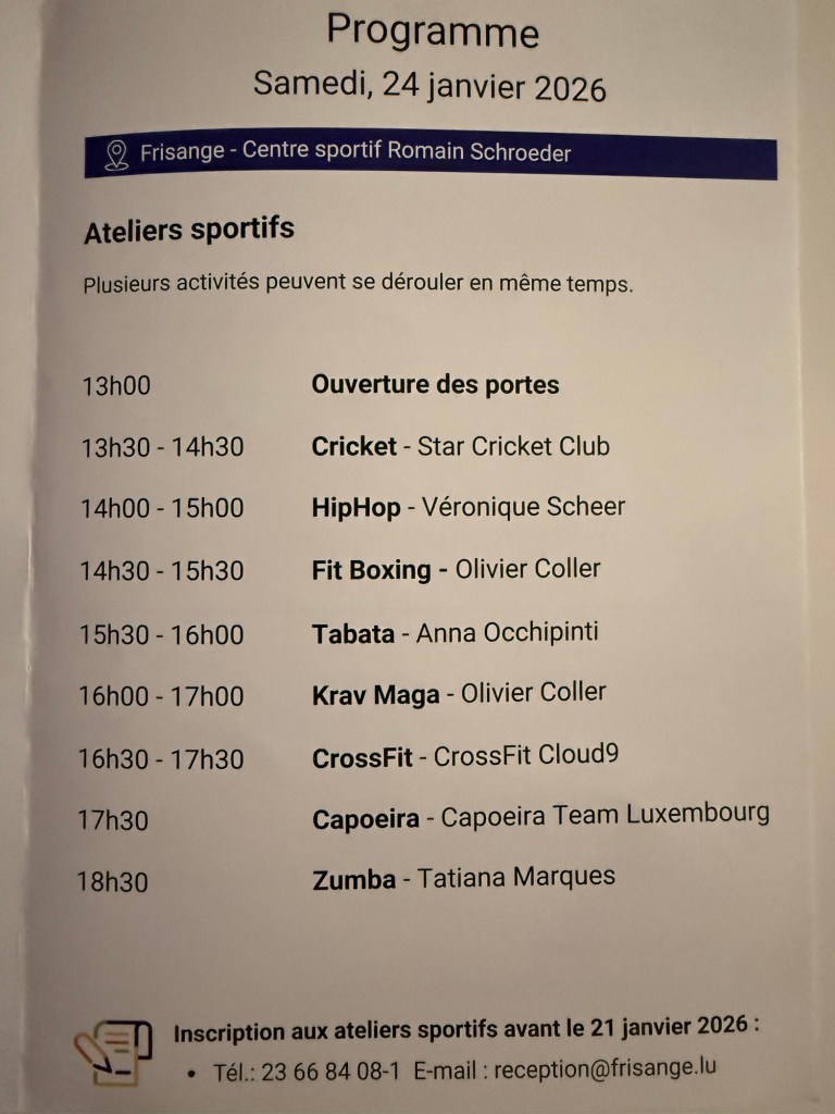 La journée du samedi se déroule au Centre sportif Romain Schroeder à Frisange. Dès 13h, le public peut participer à de nombreux ateliers sportifs : cricket, hip-hop, fit boxing, tabata, krav maga, crossfit, capoeira ou encore zumba. Plusieurs activités se déroulent en parallèle, favorisant la découverte et la mixité des pratiques sportives.