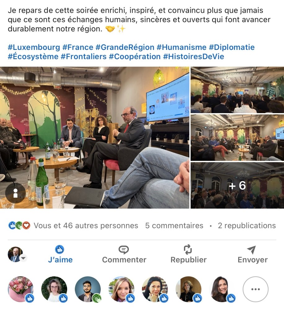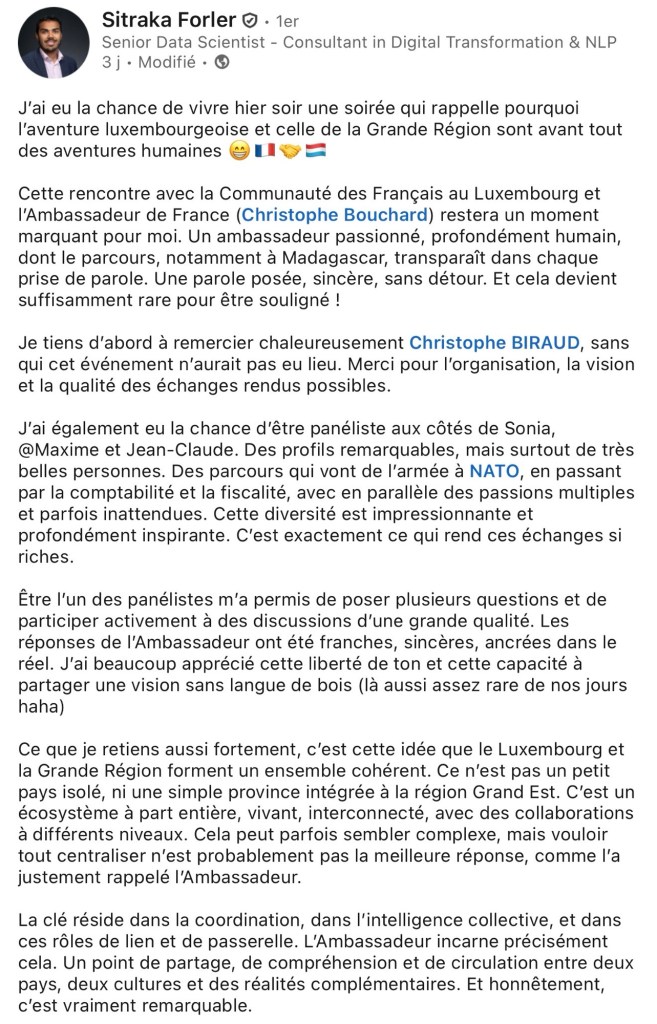 La personnalité et la sensibilité de chacun ont contribué à la richesse des échanges. Ce fut l’occasion de rappeler que la communauté des Français du Luxembourg est avant tout une mosaïque d’initiatives, de talents et d’expériences partagées.