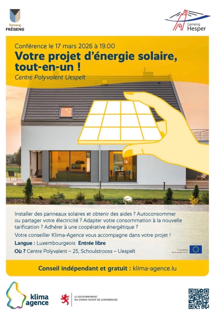 La transition énergétique s’accélère au Luxembourg et de plus en plus de particuliers envisagent de produire leur propre électricité. Pour accompagner ces démarches, une conférence publique consacrée aux projets d’énergie solaire se tiendra le 17 mars 2026 à 19h au Centre Polyvalent d’Uespelt.