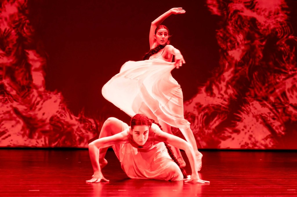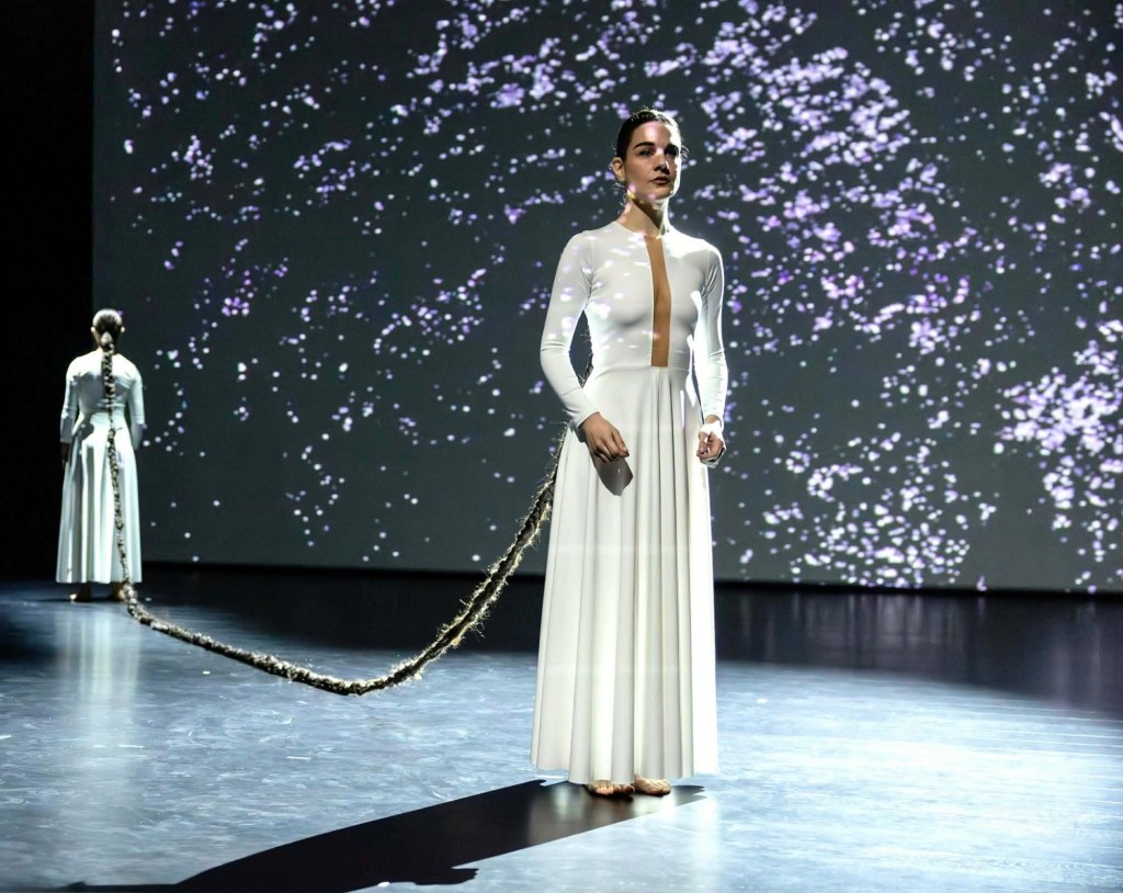 La mise en scène s’appuie sur une narration stylisée et rituelle, inspirée notamment des codes du Théâtre Nô, tout en intégrant la fluidité de la danse contemporaine et l’intensité expressive du chant lyrique. L’ensemble crée une atmosphère singulière, presque hypnotique, où la musique et le mouvement deviennent un langage universel.