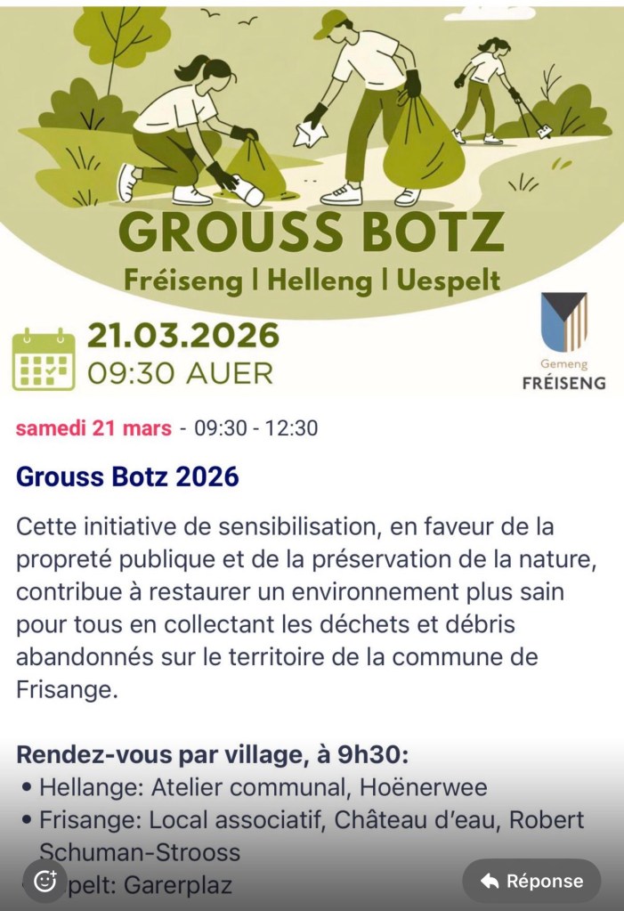 Ce samedi 21 mars 2026, plusieurs membres engagĂ©s de lâamicale du domaine Schoumansbongert, dont : Françoise Meyer et Christophe Biraud de la Commission ĂgalitĂ© des chances de la commune de Frisange et Mickael (Ă©ducateur ), Marc Kal (Ă©ducateur), Brigitte (amicale du domaine Schoumansbongert), Fernando (Aveugle) et Jean-Marie (en chaise roulante) ont trĂšs largement participĂ© Ă lâopĂ©ration nationale Grouss Botz organisĂ©e dans la commune de Frisange. Une action sociale, inclusive, utile et environnementale âŠ.