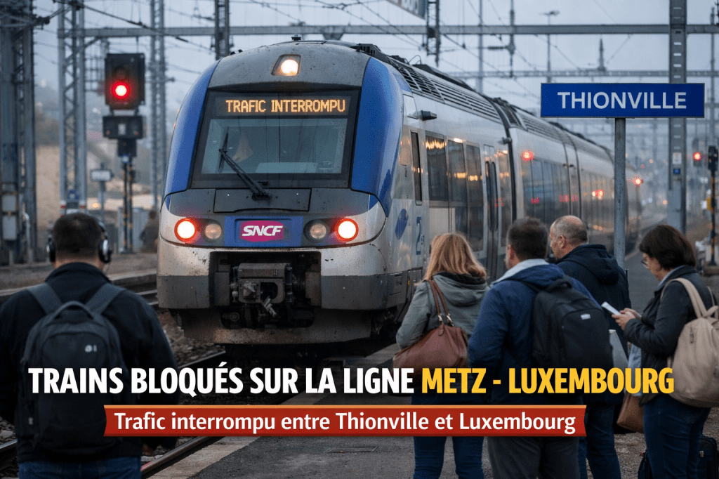La circulation des trains est totalement interrompue ce matin sur la ligne TER Metz–Luxembourg, dans les deux sens, perturbant fortement les déplacements des frontaliers. Plusieurs voyageurs signalent être bloqués à bord des trains, sans information claire sur l’origine de l’incident ni sur la reprise du trafic.