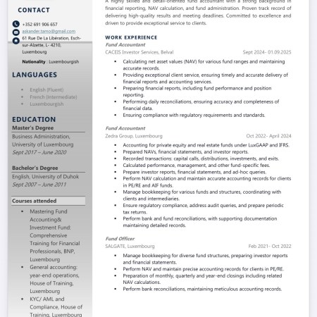 CV d’Askander TAMO / Fund Administration, Fund Accounting, Transfer Agency, AML / recherche d’emploi au Luxembourg …