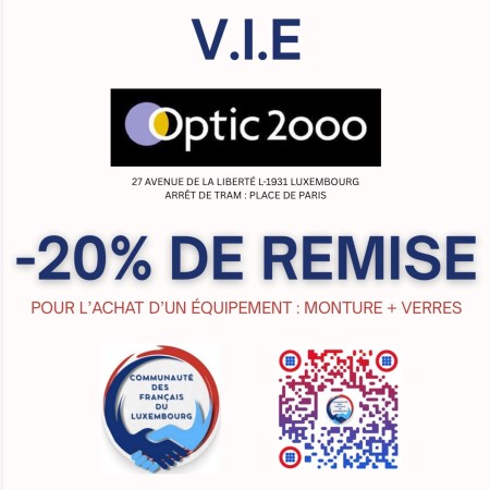 Pour vos lunettes, vos verres et montures, offre spéciale pour les V.I.E et les membres ou sympathisants de la « Communauté des Français du Luxembourg » chez Optic 2000…