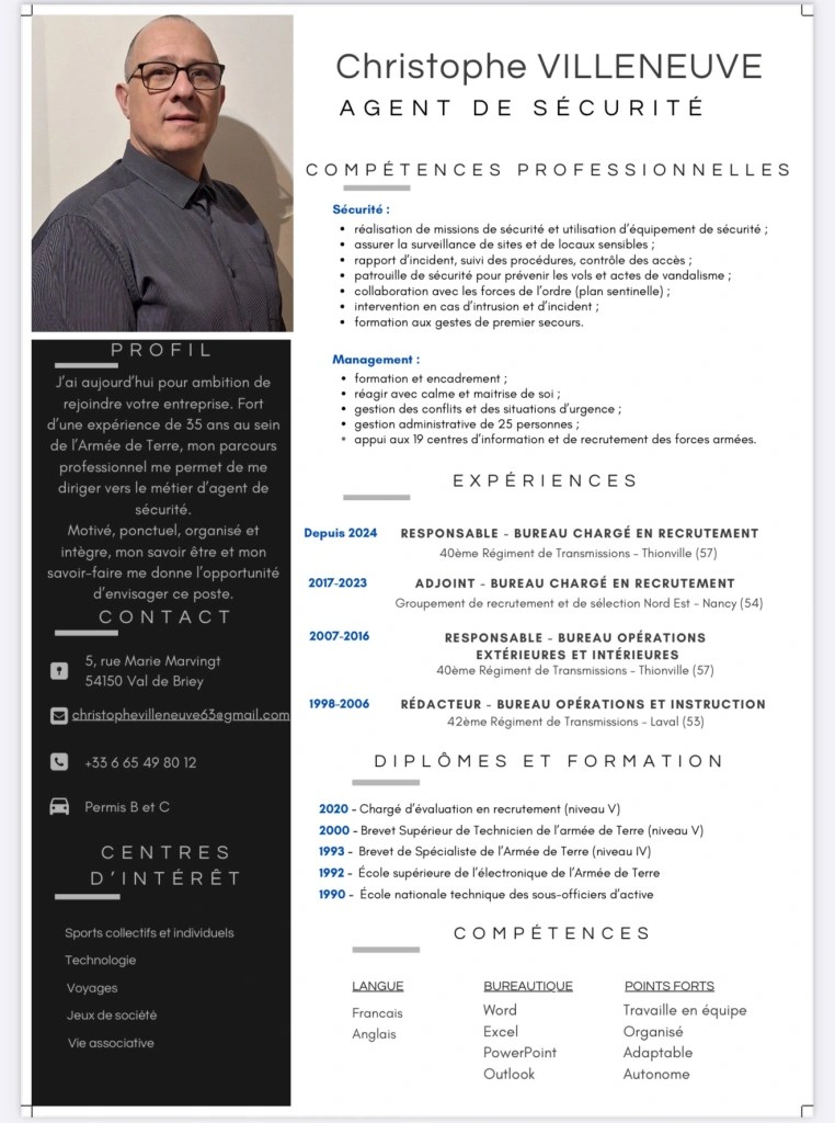 CV de Christophe VILLENEUVE / Sous-Officier supérieur (Militaire) – Polyvalent – agent de sécuritént / Responsable en Systèmes d’Information