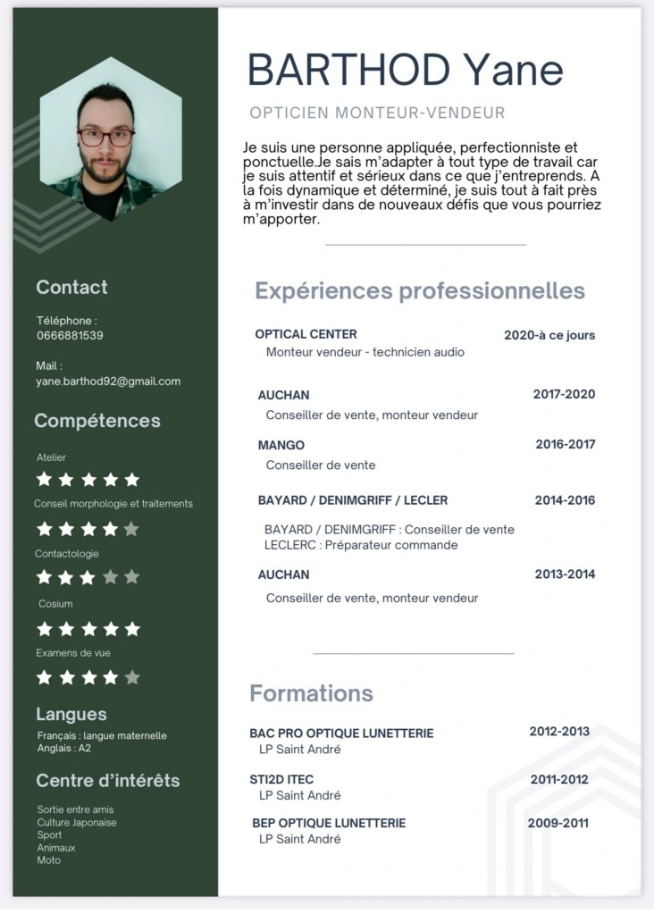 CV de Yane BARTHOD / OPTICIEN Monteur Vendeur /