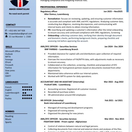 🇫🇷🤝🇱🇺 CV de ABASSI ASMATULLAH / (AML/KYC) en recherche de job et opportunités au Luxembourg…